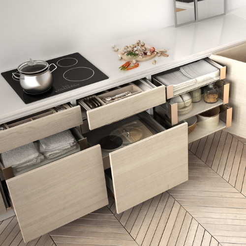 • Les rangements : colonnes intégrées, tiroirs coulissants, solutions d’angles optimisées.